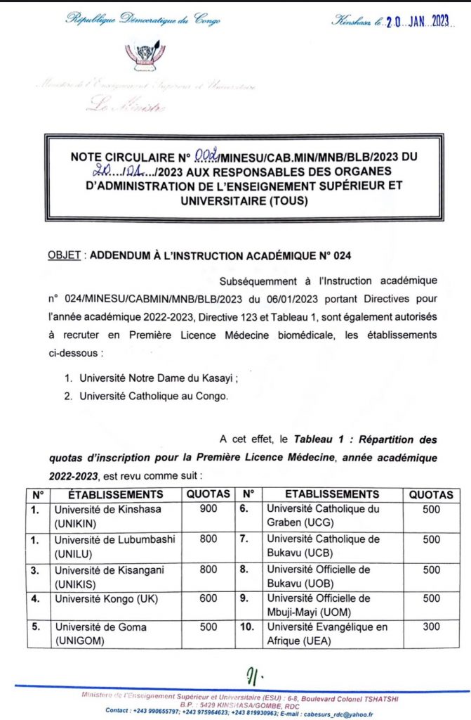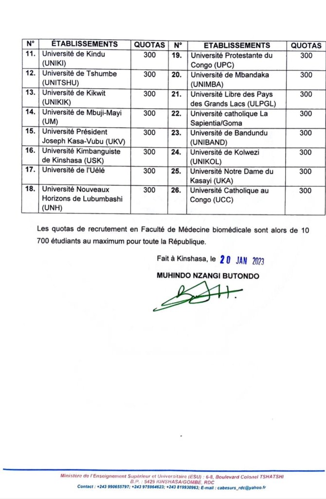 Le 20 Janvier 2023, le ministre de l’Enseignement Supérieur et Universitaire, M. Muhindo, a publié une note circulaire officielle annonçant que 26 universités en République Démocratique du Congo (RDC) sont désormais autorisées à organiser la faculté de médecine. Cette décision marque une avancée significative dans la réforme du secteur de l’éducation supérieure en RDC, en particulier pour la formation des futurs professionnels de santé.